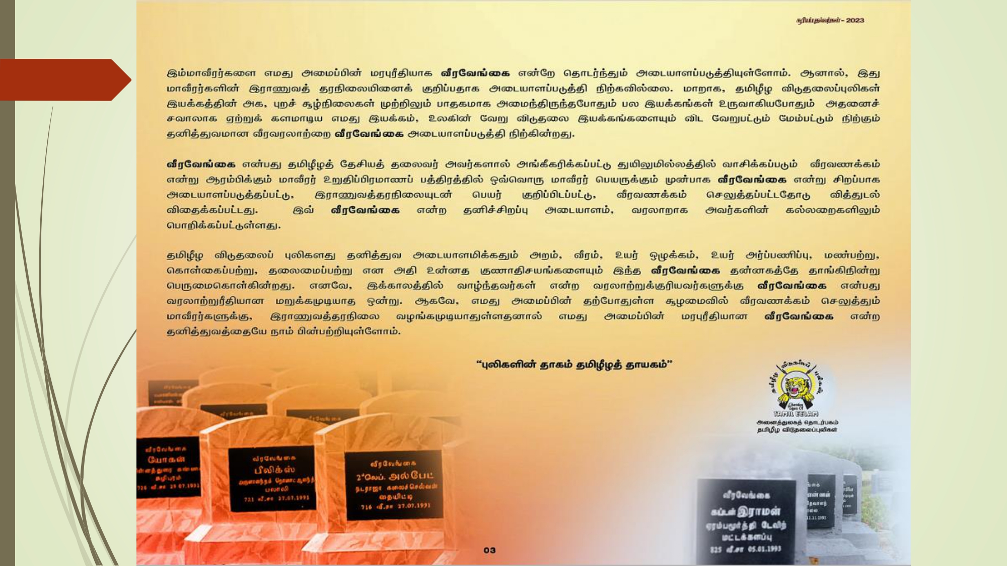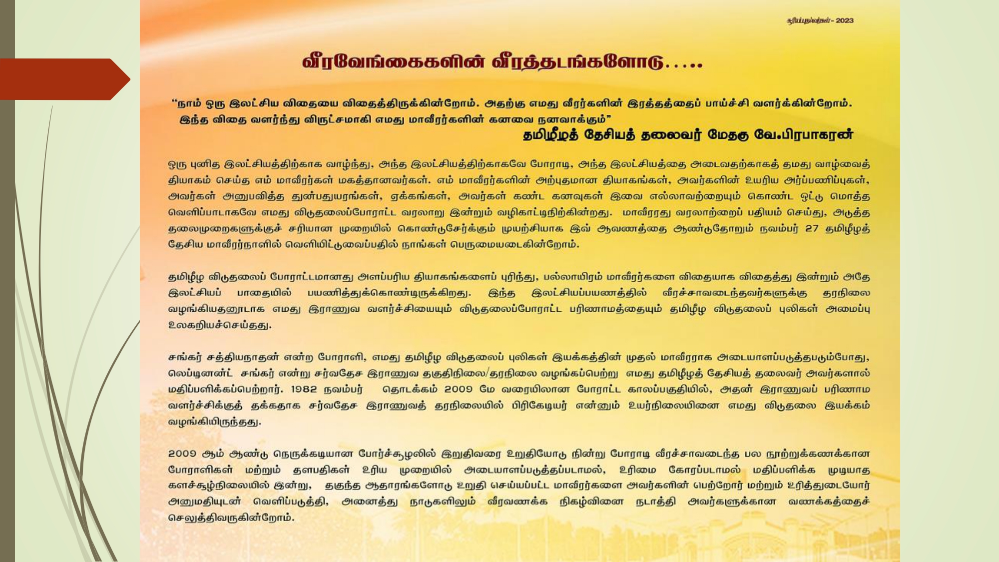 рокрпБрогрпНрокроЯрпБродрпНродро┐ро╡ро┐роЯро╛родрпБ ро╡ро┐роЯрпБродро▓рпИроХрпНроХро╛ропрпН роЕрокрпНрокро┤рпБроХрпНроХро┐ройрпНро▒ро┐ роЪрпЖропро▓ро╛ро▒рпНро▒ро┐роп роЙро▒рпБродро┐ропро┐ройрпН ро╡роЯро┐ро╡рооро╛роХро┐роп роЕроирпНрод роЙродрпНродроо ро╡рпАро░ро░рпН, ро╡ро╛ро┤рпНро╡ро┐ройрпН роОро▓рпНро▓ро╛роХрпН роХро╛ро▓ роХроЯрпНроЯроЩрпНроХро│ро┐ро▓рпБроорпН роЪро▓роЪро▓рокрпНрокрпБроХрпНроХро╛роЯрпНроЯро╛родрпБ родро│ро░ро╛род роЙро▒рпБродро┐ропрпБроЯройрпБроорпН родройрпНройроЯроХрпНроХродрпНродрпБроЯройрпБроорпН ро╡ро╛ро┤рпНроирпНродродрпБ рокрпЛройрпНро▒рпЗ роЗро▒рпБродро┐роХрпН роХрогродрпНродро┐ро▓рпБроорпН роЕрокрпНрокроЯро┐ропрпЗ роЙро▒рпБродро┐ропро┐ройрпН ро╡роЯро┐ро╡рооро╛роХро┐ 18 роорпЗ 2009 роЕройрпНро▒рпБ ро╡рпАро░роЪрпНроЪро╛ро╡рпИродрпН родро┤рпБро╡ро┐роХрпНроХрпКрогрпНроЯро╛ро░рпН. роОроорпН роиро┐ройрпИро╡рпЖро▓рпНро▓ро╛роорпН роиро┐ро▒рпИроирпНрод рокрпБродро┐ропро╡ройрпН рооро╛ро╕рпНроЯро░рпН роЗройрпНро▒рпБ роОроорпНроорпБройрпНройрпЗ ро╡ро┐роЯрпБродро▓рпИропро┐ройрпН ро╡ро┐родрпНродро╛роХро┐, родрооро┐ро┤рпАро┤родрпНродро┐ройрпН ро╡рпАро░ ро╡ро░ро▓ро╛ро▒ро╛роХро┐ роиро┐ро▒рпНроХро┐ройрпНро▒ро╛ро░рпН.